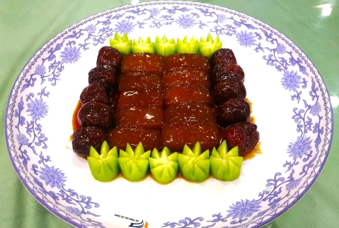 2.锅内放入花生油、冰糖小火炒至鸡血红时下入牛头皮快速翻匀上色,然后烹入葱椒料酒,加入清汤、大枣烧开,放入蚝油、生抽调味转小火㸆至汤汁将尽时加入味精,淋上葱椒油翻匀出锅装盘,点缀上刻好的黄瓜墩即可。